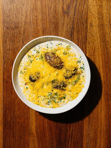 - fermentovaná červená pšenice, stroček, vejce, medvědí česnek, houbové garum