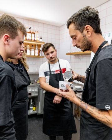 - správnému postoji, pohybům a držení těla u latte artu.